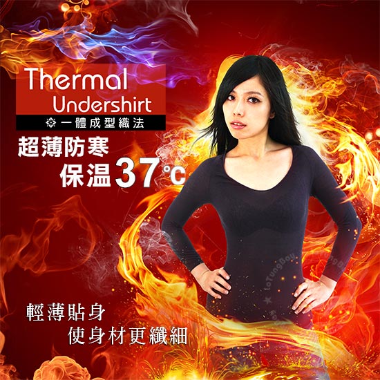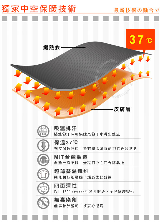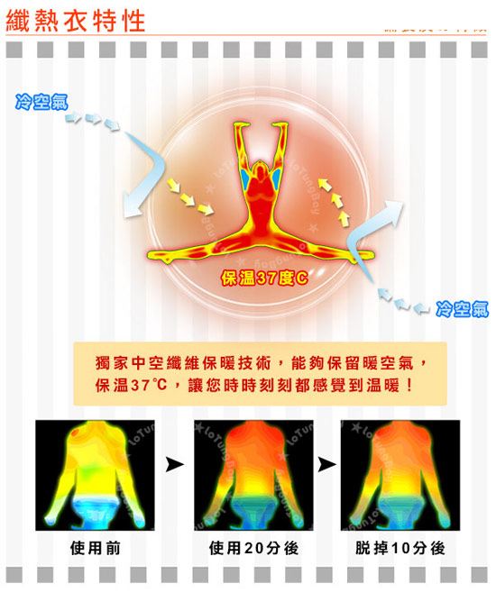 「37℃超薄性感纖熱衣」突破市售保暖衣設計,獨家中空纖維保暖技術,鎖住人體熱能,加速保暖,產生高效能蓄溫效果保溫在37℃。